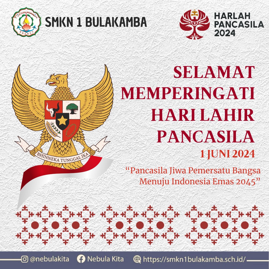 Bulakamba, 1 Juni 2024. Berlokasi di Lapangan upacara SMK N 1 Bulakamba. Berbeda dengan situasi biasanya tepat 1 Juni yang merupakan Hari Lahir Pancasila yang ditetapkan sebagai hari Libur Nasional, peserta upacara yang terdiri dari dewan guru dan staf TU beserta siswa terlihat antusias. Kegiatan dimulai tepat pukul 07.00 WIB dengan pembina upacara Ibu Dra. Rr. Ismijarti Dwi Retnaningtyas selaku kepala sekolah. Peringatan dilaksanakan dengan pengibaran sang Saka Merah Putih dan pembacaan amanat upacara kepala Badan Pembinaan Ideologi Pancasila (BPIP) dengan tema “Pancasila Jiwa Pemersatu Bangsa Menuju Indonesia Emas 2045”. Tema ini mengandung maksud bahwa Pancasila menyatukan kita dengan segala perbedaan suku, agama, budaya, dan bahasa dalam menyongsong 100 tahun Indonesia Emas yang maju , mandiri dan berdaulat.